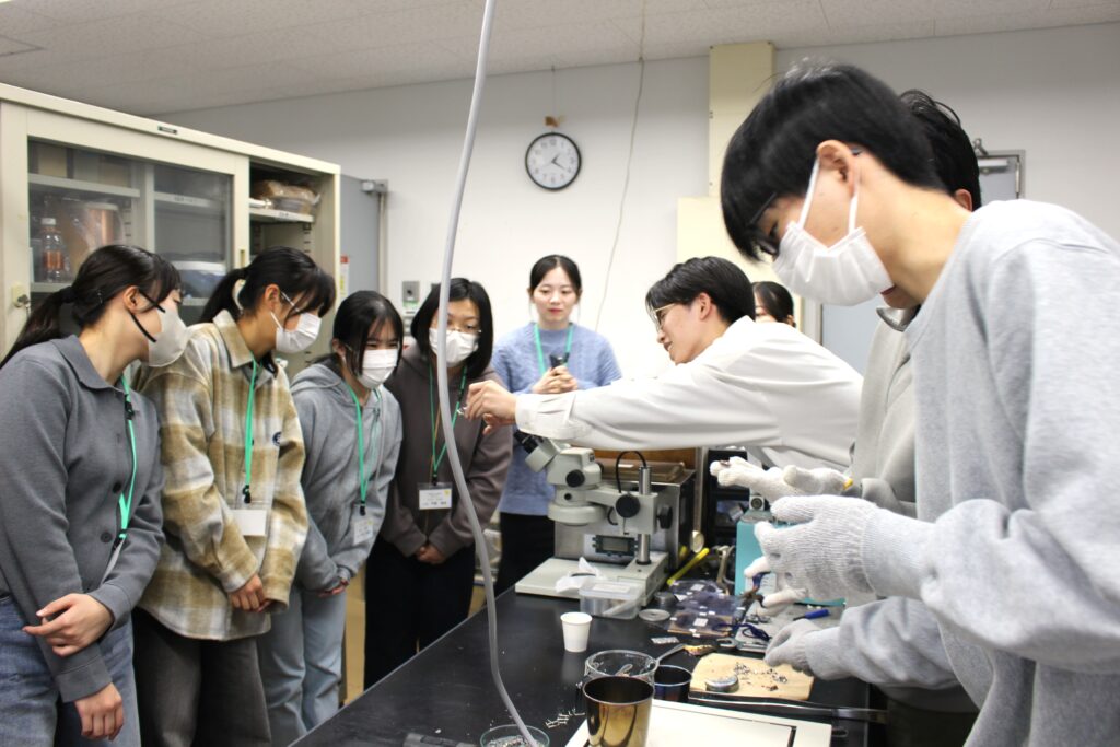 午後の研究室見学では、 GRC(地球深部ダイナミクス研究センター)と工学部機器材料学研究室を訪問し、専門設備の見学や簡単な実験の体験を行いました。普段見ることのできない研究現場に触れ、「面白かった」「貴重な体験ができた」といった声が多く寄せられました。