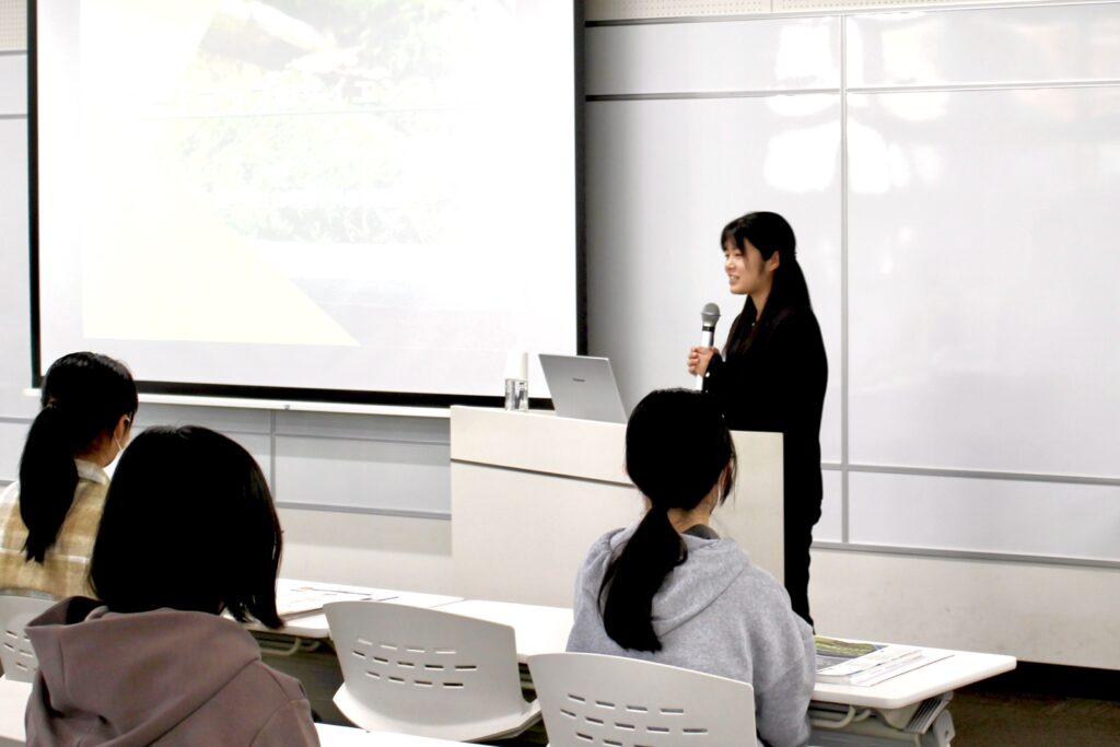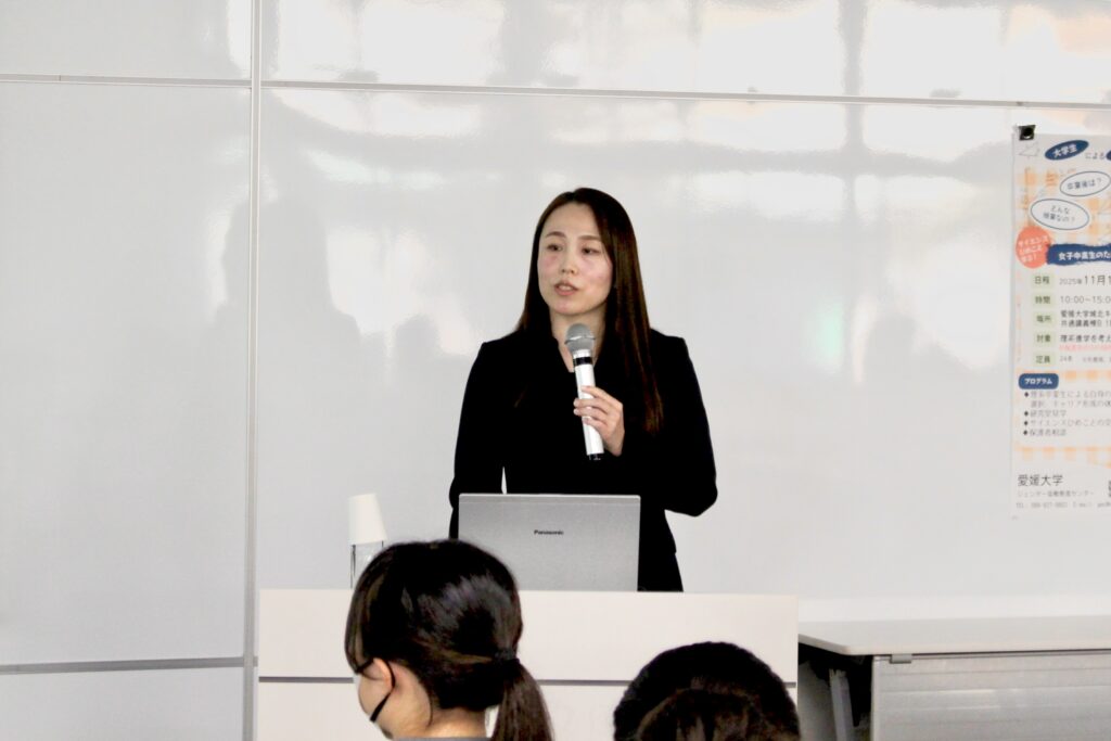 その後実施された理系学部卒業生による講演では、工学部卒業生・澤田一恵さん(築野食品工業)、農学部卒業生・坪田彩さん(伊予銀行)、社会共創学部卒業生・川北真鈴さん(松山市役所)の3名が登壇しました。学部選択時の悩みや進路決定のプロセス、就職後のキャリア形成等の経験談が共有され、参加者は熱心に耳を傾けていました。