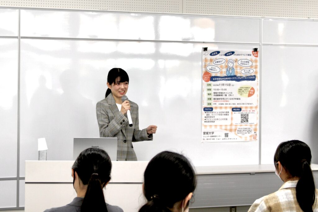 令和7年11月15日(土)、次世代科学人材育成拠点とジェンダー協働推進センターの共催で、女子中高生の理系進路選択を応援するイベント「女子中高生のためのロードマップtoサイエンス2025」を開催しました。当日は、女子中高生と保護者あわせて約40名が参加し、本学の理系女子学生チーム「サイエンスひめこ」が中心となって運営を担当しました。